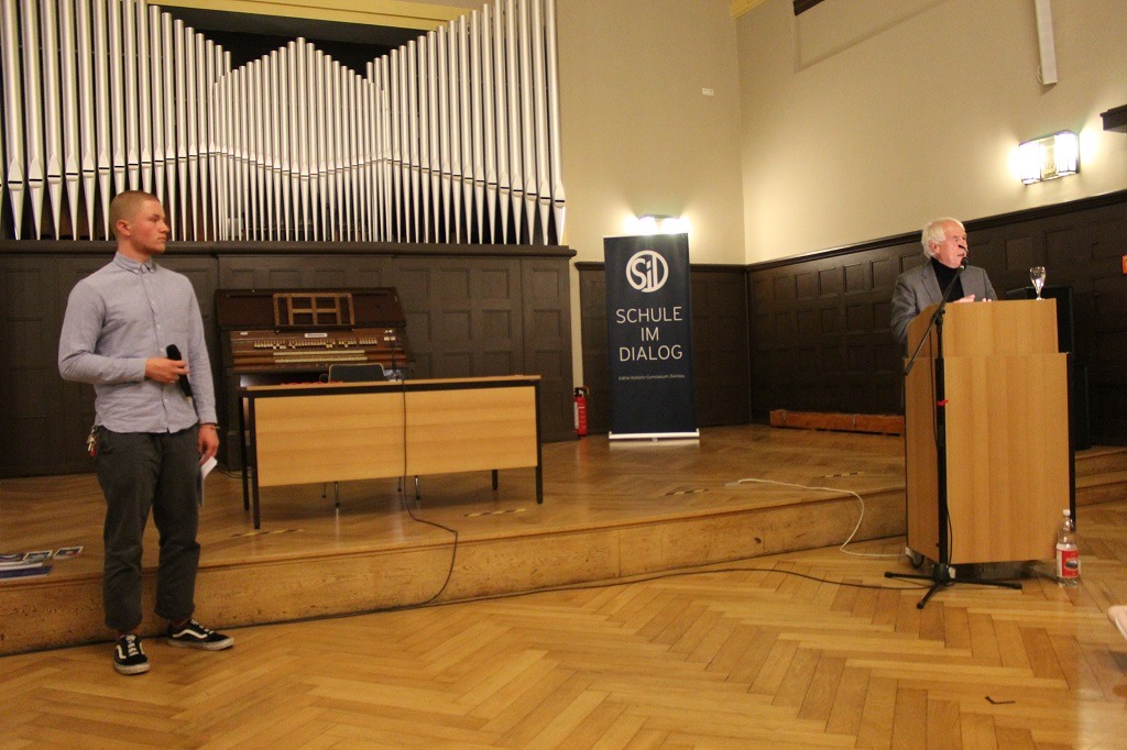 „Wir als Wähler kaufen die Katze im Sack“ war eine der Hauptaussagen des Gastes, der am 14. Oktober 2021 die Schülerinnen und Schüler sowie Lehrerinnen und Lehrer und Gäste am Käthe-Kollwitz-Gymnasium mit einem Vortrag beehrte. Die Aula war gut gefüllt, als Le Thu An Dao Tu mit einem Orgelstück die Veranstaltung eröffnete. Anschließend stellten Maxi Köppel und Josefine Schmidt das Leben und Wirken des Referenten vor. Prof. Dr. Jürgen W. Falter spezialisierte sich auf die Wähler und Mitglieder der Nationalsozialistischen Deutschen Arbeiterpartei (NSDAP) und darauf, weshalb Adolf Hitler eine fesselnde Anziehungskraft auf die Deutschen ausstrahlte. Nach seiner Emeritierung blieb er der Universität Mainz treu: als Senior-Forschungsprofessor. Da er ein ausgesprochen gefragter Politologe ist, war es eine besondere Ehre, ihn bei „Schule im Dialog“ begrüßen zu dürfen.