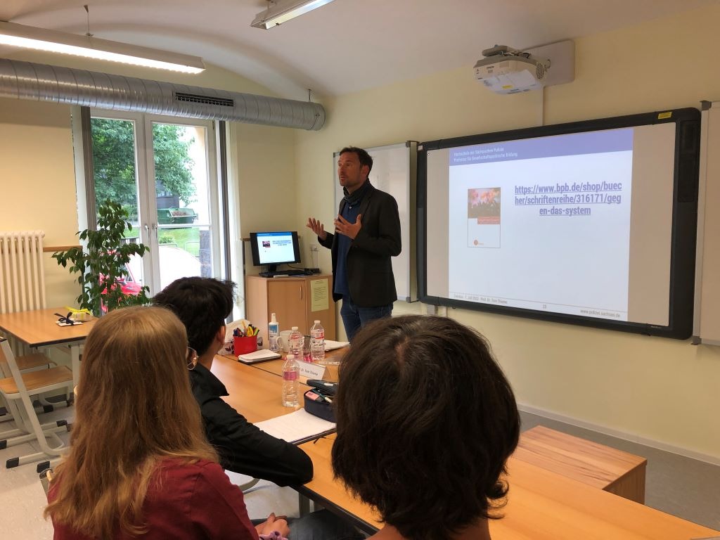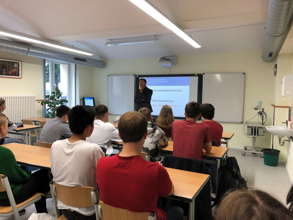 Schnell vergingen die 90 Minuten. Eine Vorlesung, eine Fragerunde. Tiefe Einblicke und neue Erkenntnisse. Ein gestärktes Demokratieverständnis. Das Gehörte über den Links- und Rechtsextremismus fiel bei den Zuhörern auf fruchtbaren Boden. Sie werden sich noch lange an den Morgen erinnern und vieles von dem Gelernten in zukünftigen Auseinandersetzungen nutzen können. Wir hoffen, Herr Prof. Thieme erfreut sich einer schnellen Genesung. Im Namen der Schülerschaft danken wir ihm (und der Sächsischen Landeszentrale für politische Bildung) vielmals.
