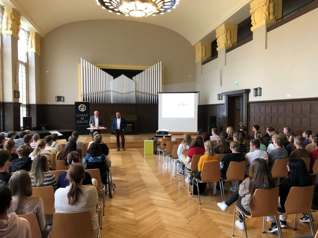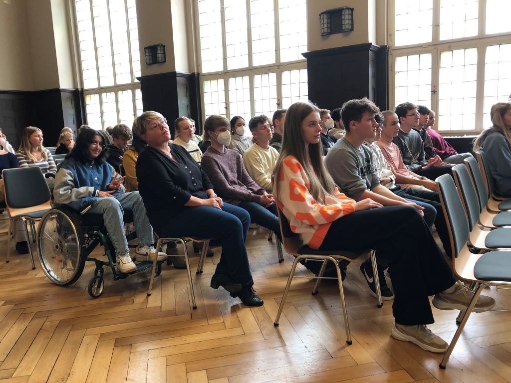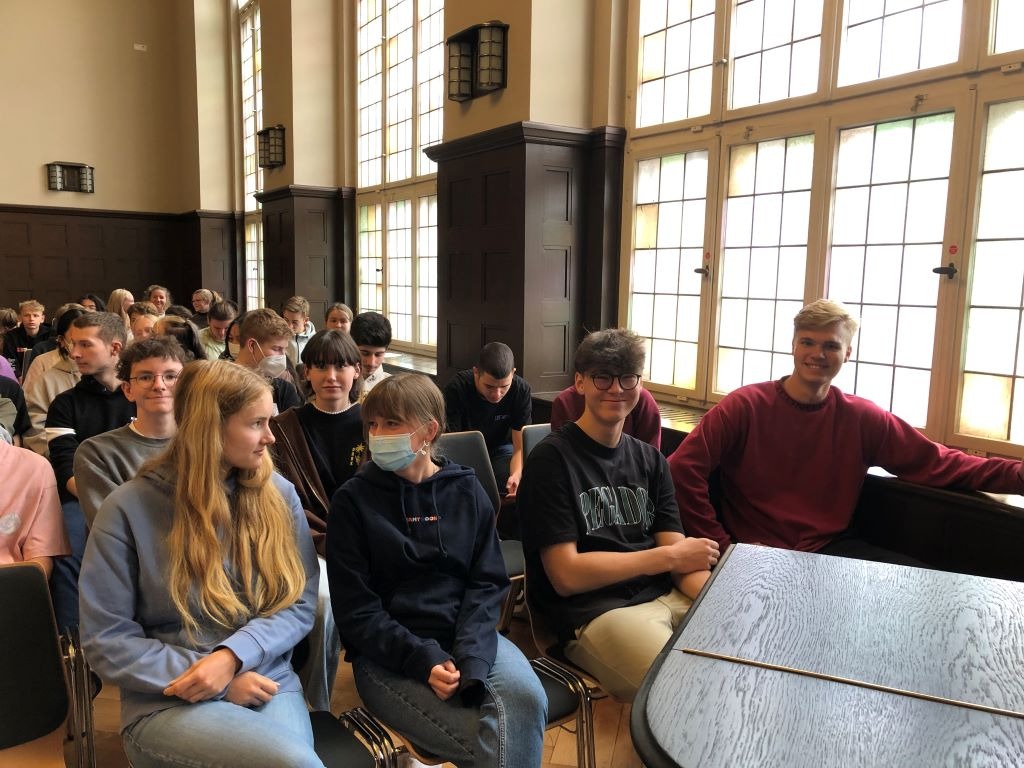 Am 20. September 2022 führte Dr. Jens Baumann (Beauftragter für Vertriebene und Spätaussiedler im Sächsischen Staatsministerium des Inneren) die Schülerinnen und Schülern der 9. und 10. Klassen in die Ausstellung „Wolfskinder“ ein, die bis zu den Herbstferien im Foyer vor der Aula unseres Gymnasiums zu besichtigen ist. Sie dokumentiert ein historisches Nischenthema.