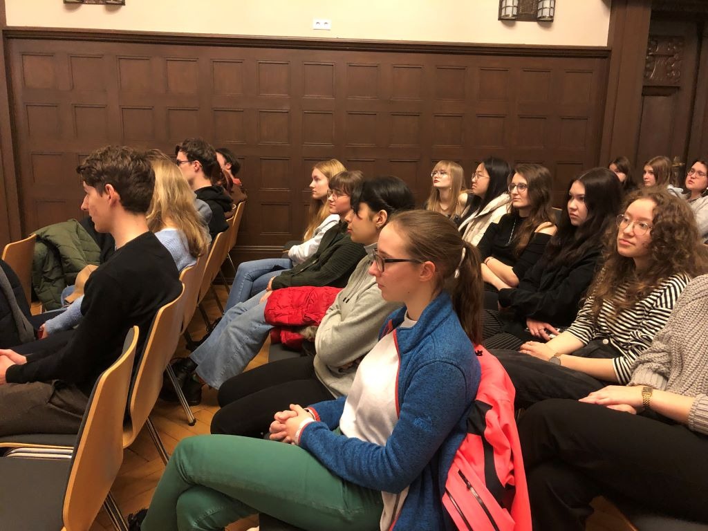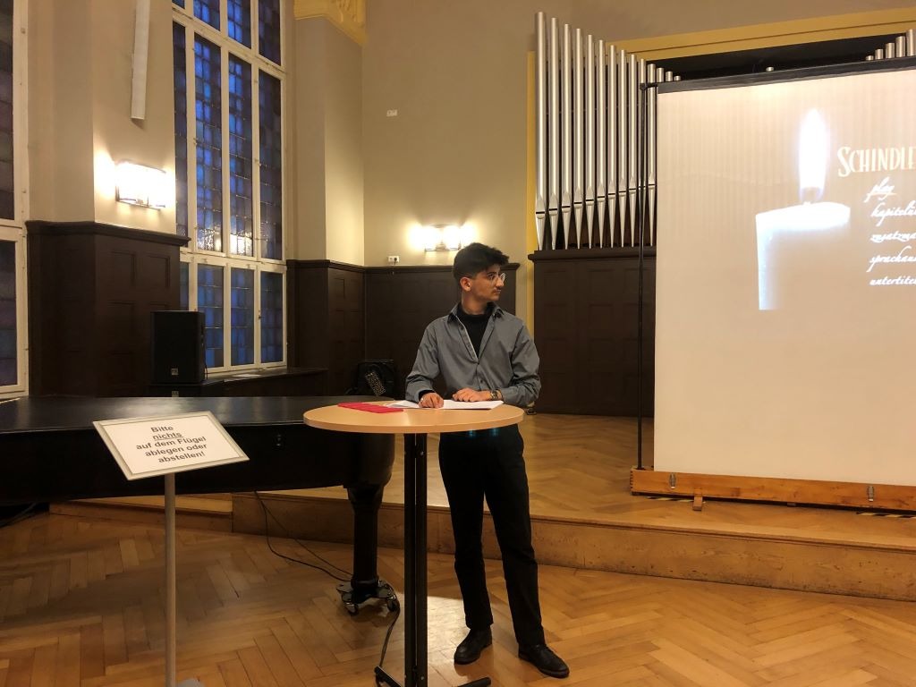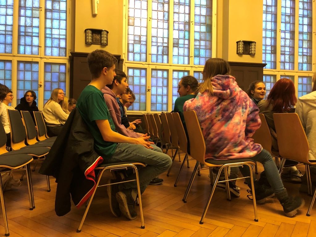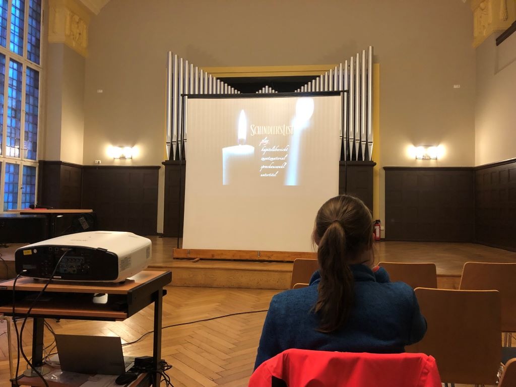 Frau Zürch eröffnete den Kino-Abend und gab das Wort an Hassan Gata und Oliver Baron weiter, die einführenden Worte zum Film „Schindlers Liste“ fanden. Mucksmäuschenstill war es in der Aula, alle folgten gefesselt dem Geschehen auf der Leinwand. Viele hatten der Veranstaltung mit Frau Prof. Erika Rosenberg, die im vergangenen November über Oskar Schindler und vor allem über die mutigen Taten seiner Frau Emilie gesprochen hatte, beigewohnt. Nach dem Filmabspann fanden sich die Schülerinnen und Schüler in vier kleinen Gesprächsrunden zusammen, um über das Gesehene zu sprechen, Fragen loszuwerden. Rasch zeigte sich, das war leichter gesagt als getan. Vielen fehlten die Worte, sie hatten noch mit sich und den verwirrenden Gedanken zu tun, die der Film in ihnen aufsteigen ließ.