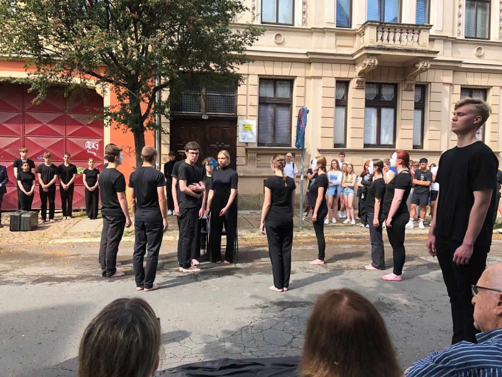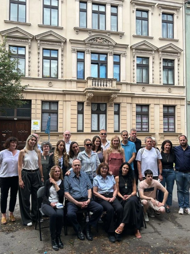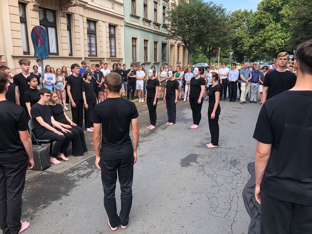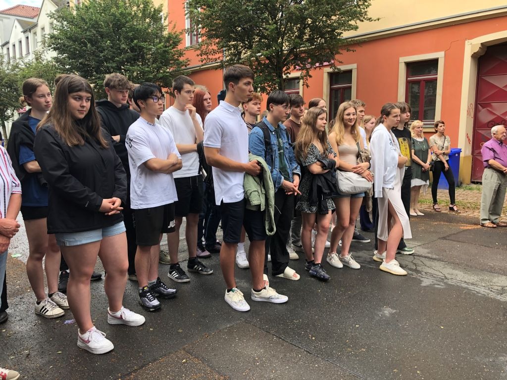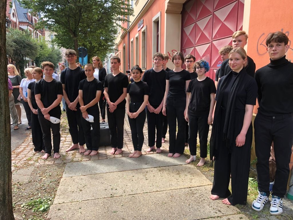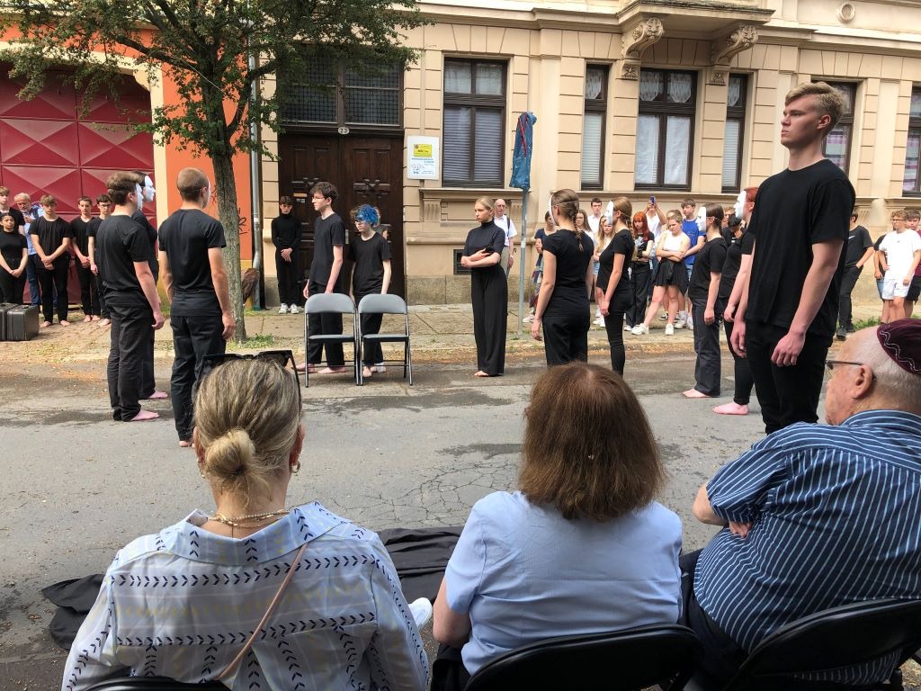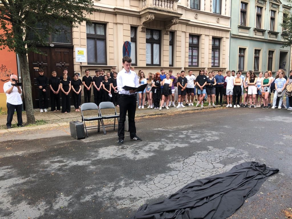 Die Projektgruppe Geschichte, das sind 20 Schülerinnen und Schüler der Klassenstufen 10 und 11, weihte am Dienstag, dem 20. Juni 2023, um 10:00 Uhr vor dem Haus Römerstraße 23 gemeinsam mit den aus Israel und Deutschland angereisten Angehörigen zehn neue „Stolpersteine“ ein. Edna Friedländer und Aya Rimon richteten gleichsam bewegte wie bewegende Worte an die zahlreichen Gäste. Im Anschluss kamen die Nachfahren der Zwickauer Familie Kleinberger mit den Jugendlichen, die das „Standbild“ entwickelt und dargestellt hatten, im Gymnasium zusammen. Rasch entwickelten sich angeregte Gespräche. Ilai Arad, der Enkelsohn Issak Kleinbergers, dankte allen Beteiligten im Namen seiner Familie.