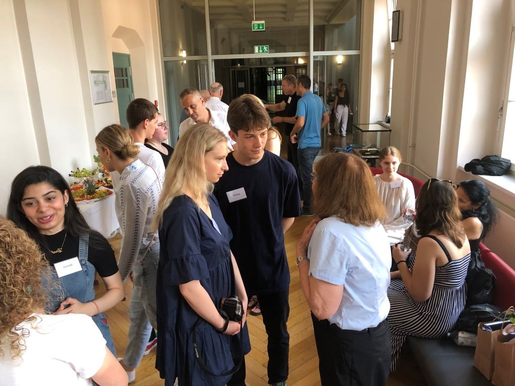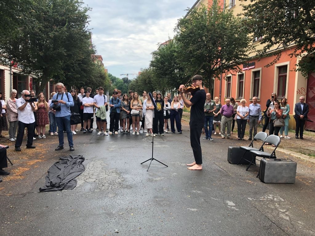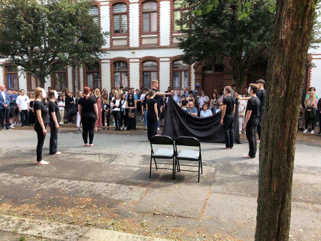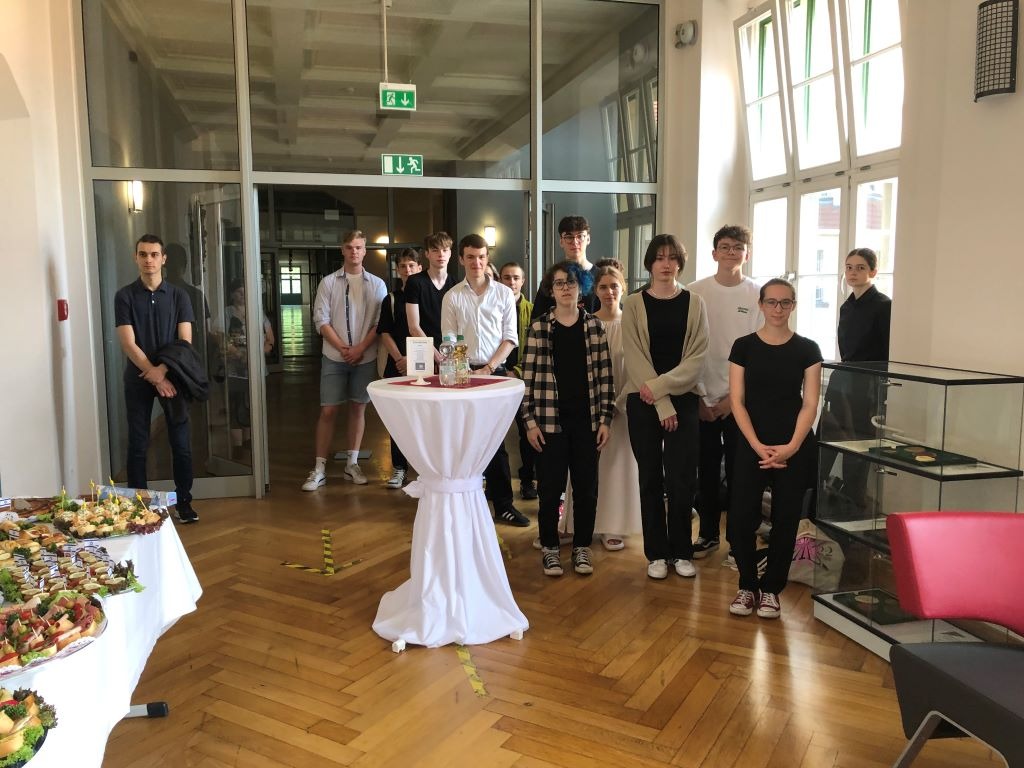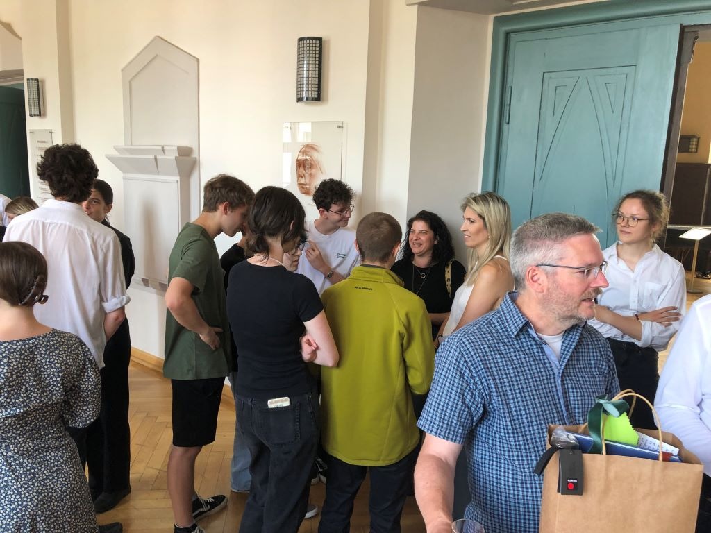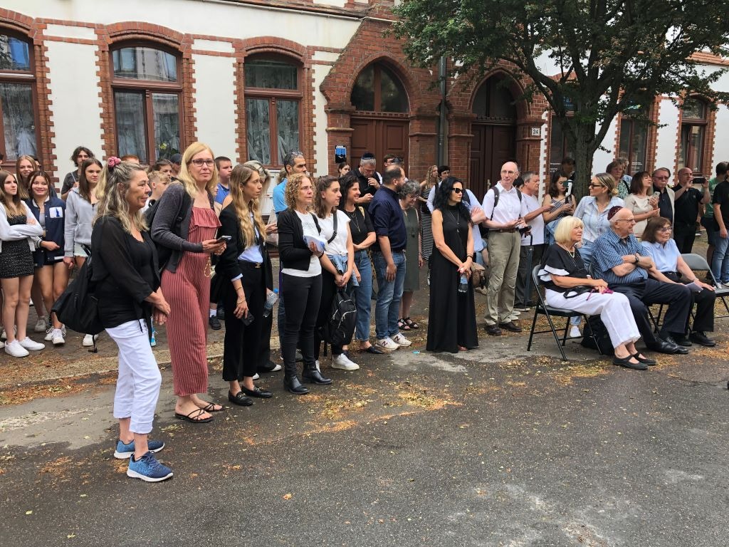 Die Projektgruppe Geschichte, das sind 20 Schülerinnen und Schüler der Klassenstufen 10 und 11, weihte am Dienstag, dem 20. Juni 2023, um 10:00 Uhr vor dem Haus Römerstraße 23 gemeinsam mit den aus Israel und Deutschland angereisten Angehörigen zehn neue „Stolpersteine“ ein. Edna Friedländer und Aya Rimon richteten gleichsam bewegte wie bewegende Worte an die zahlreichen Gäste. Im Anschluss kamen die Nachfahren der Zwickauer Familie Kleinberger mit den Jugendlichen, die das „Standbild“ entwickelt und dargestellt hatten, im Gymnasium zusammen. Rasch entwickelten sich angeregte Gespräche. Ilai Arad, der Enkelsohn Issak Kleinbergers, dankte allen Beteiligten im Namen seiner Familie.