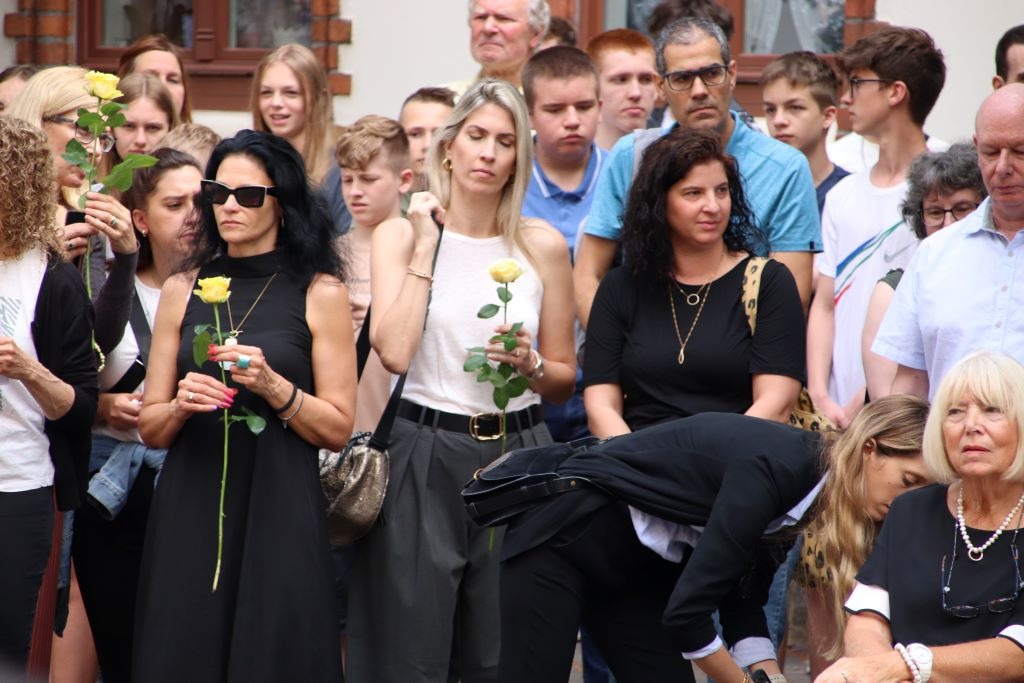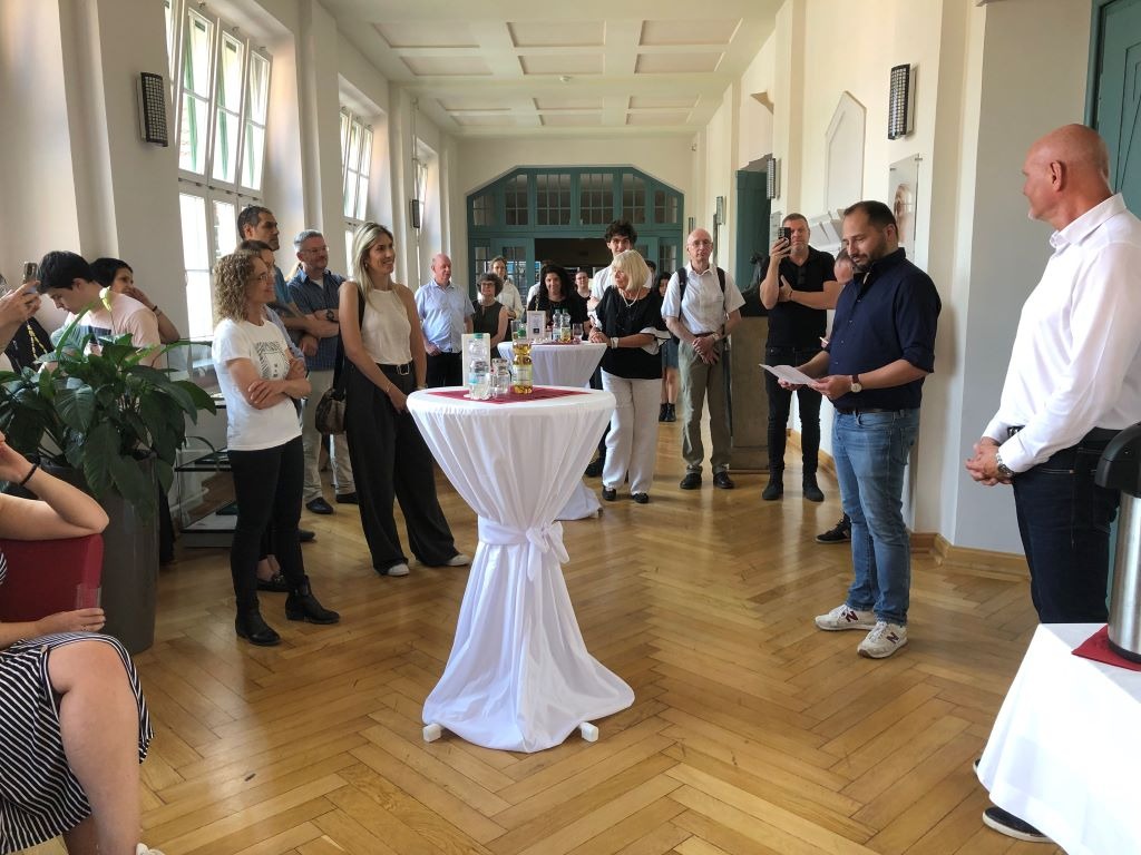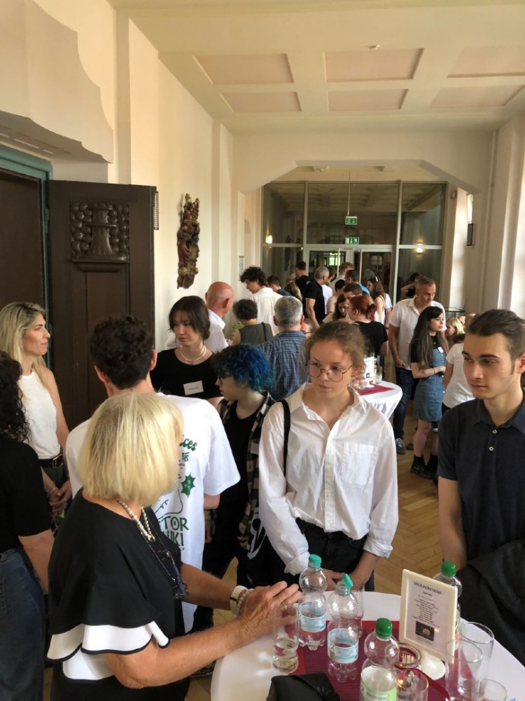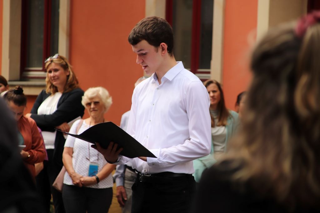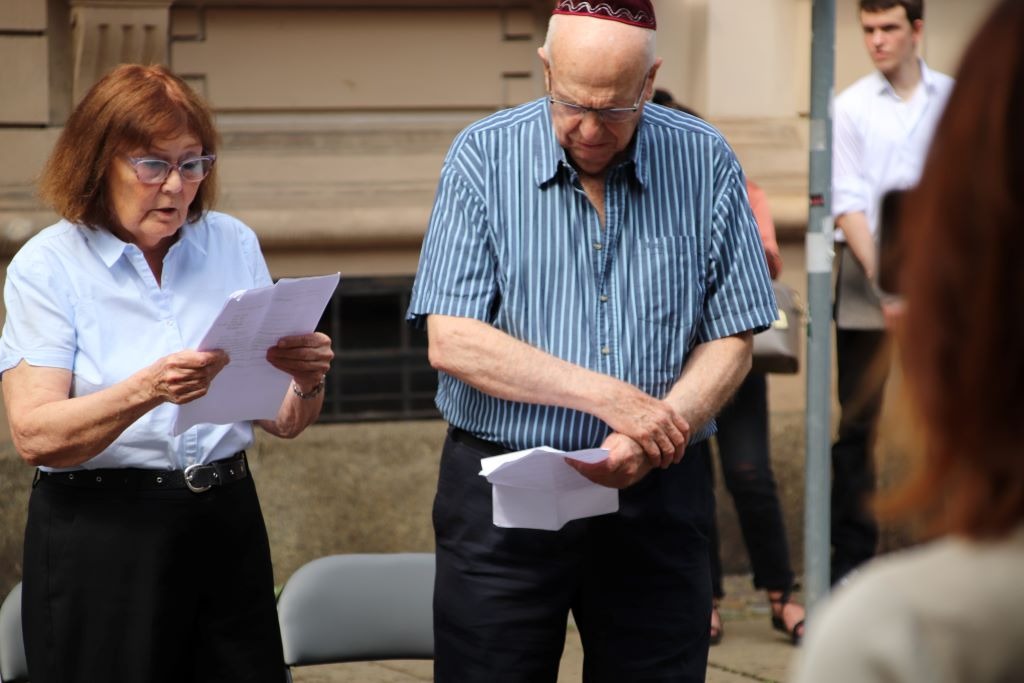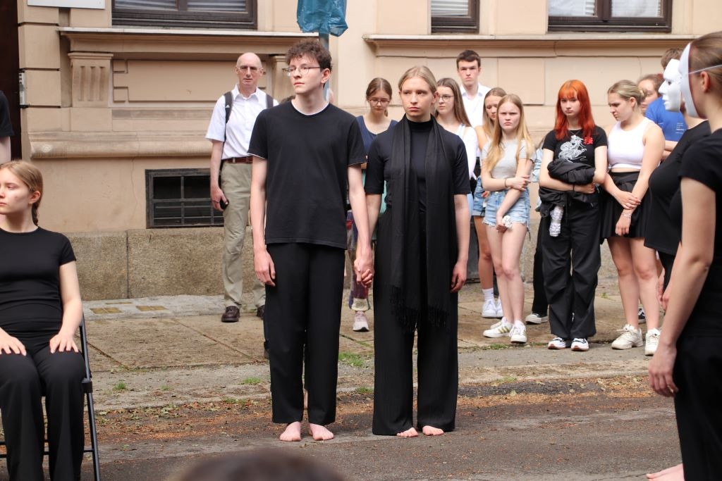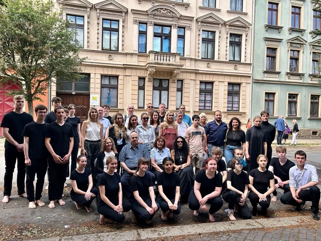 Die Projektgruppe Geschichte, das sind 20 Schülerinnen und Schüler der Klassenstufen 10 und 11, weihte am Dienstag, dem 20. Juni 2023, um 10:00 Uhr vor dem Haus Römerstraße 23 gemeinsam mit den aus Israel und Deutschland angereisten Angehörigen zehn neue „Stolpersteine“ ein. Edna Friedländer und Aya Rimon richteten gleichsam bewegte wie bewegende Worte an die zahlreichen Gäste. Im Anschluss kamen die Nachfahren der Zwickauer Familie Kleinberger mit den Jugendlichen, die das „Standbild“ entwickelt und dargestellt hatten, im Gymnasium zusammen. Rasch entwickelten sich angeregte Gespräche. Ilai Arad, der Enkelsohn Issak Kleinbergers, dankte allen Beteiligten im Namen seiner Familie.