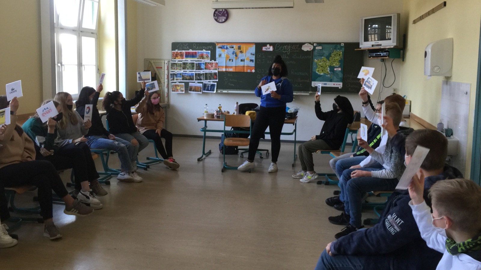 Zuerst haben wir zum gegenseitigen Kennenlernen mit ihr ein Vorstellungsspiel auf Französisch gespielt. Danach gab es für uns ein XXL-Memory mit französischen Begriffen. Dabei mussten auch die deutschen Entsprechungen zugeordnet werden. Im Anschluss hat sie ihre Heimatinsel, la Réunion, vorgestellt und interessante Fakten dazu erzählt. Wir konnten ihr viele Fragen zu den Besonderheiten, Bräuchen und Spezialitäten der Insel stellen. Kurz vor Schluss fing sie an, auf Deutsch zu reden - darüber waren alle erstaunt! Sie sagte: „Ihr habt es geschafft eine ganze Stunde Französisch zu sprechen und könnt stolz auf euch sein!“ Fazit: Es hat uns allen viel Spaß gemacht und wir hoffen, dass sich uns diese Gelegenheit nochmal bietet!