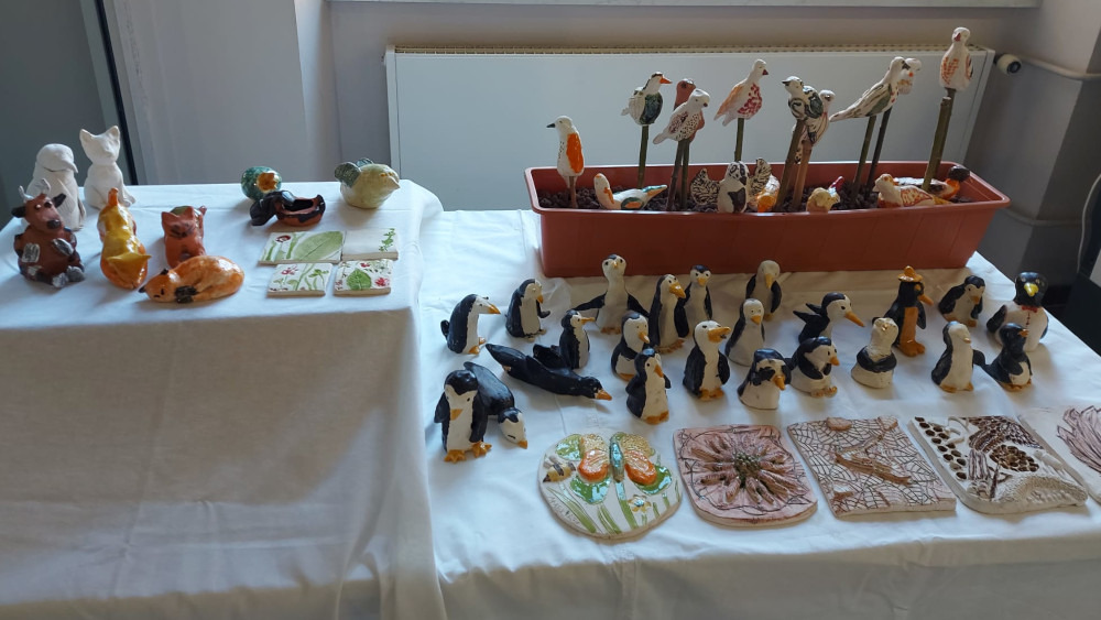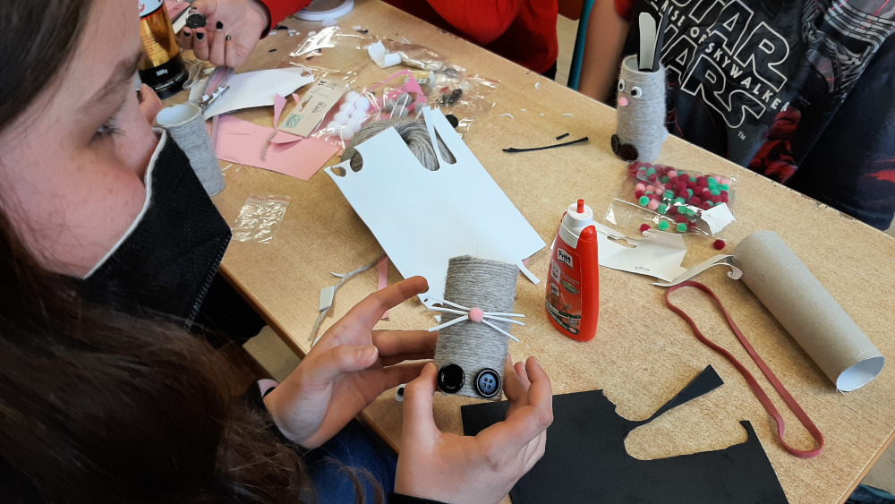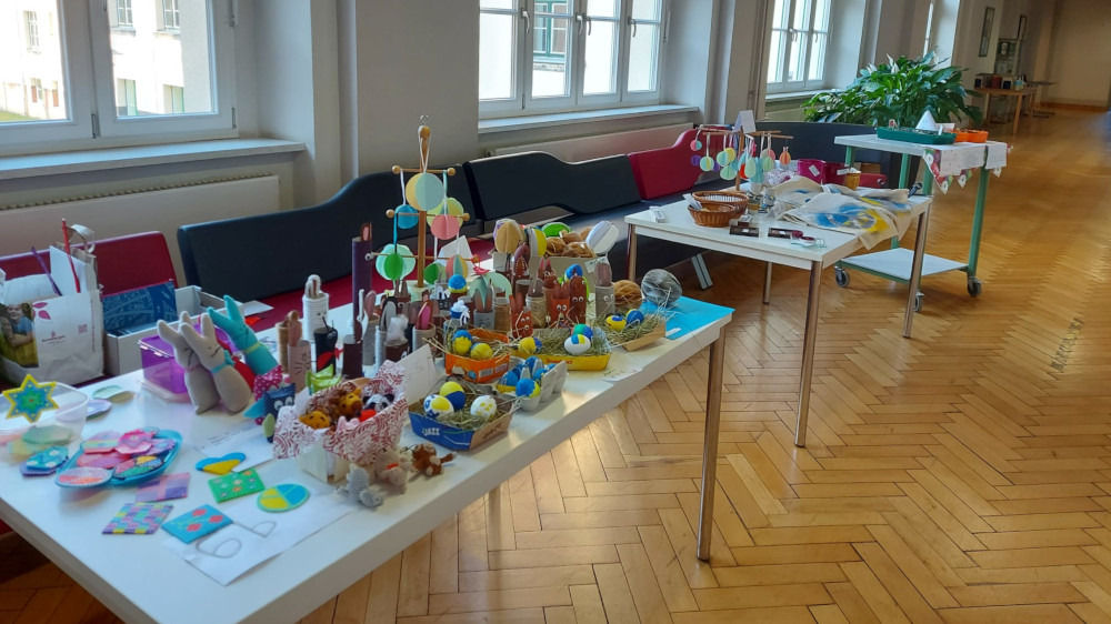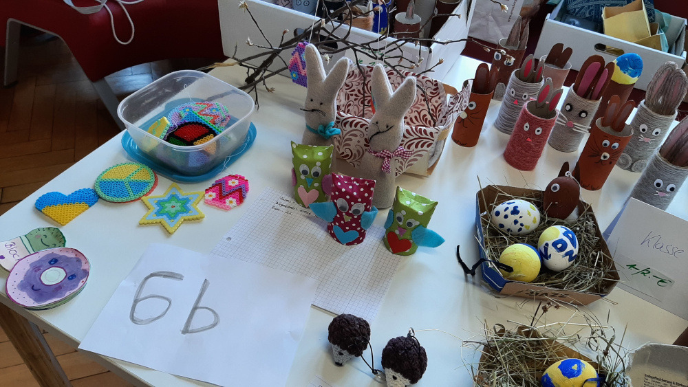 Schülerinnen und Schüler unterschiedlicher Klassenstufen beteiligten sich an der Vorbereitung des Basars und steuerten selbstgebastelte Osterdekoration, gehäkelte Stofftierchen und besprayte Stoffbeutel zum Verkauf bei. Auch Bilder, Tonvögel und die Charakterpinguine ehemaliger Schülerinnen und Schüler konnten erstanden werden.