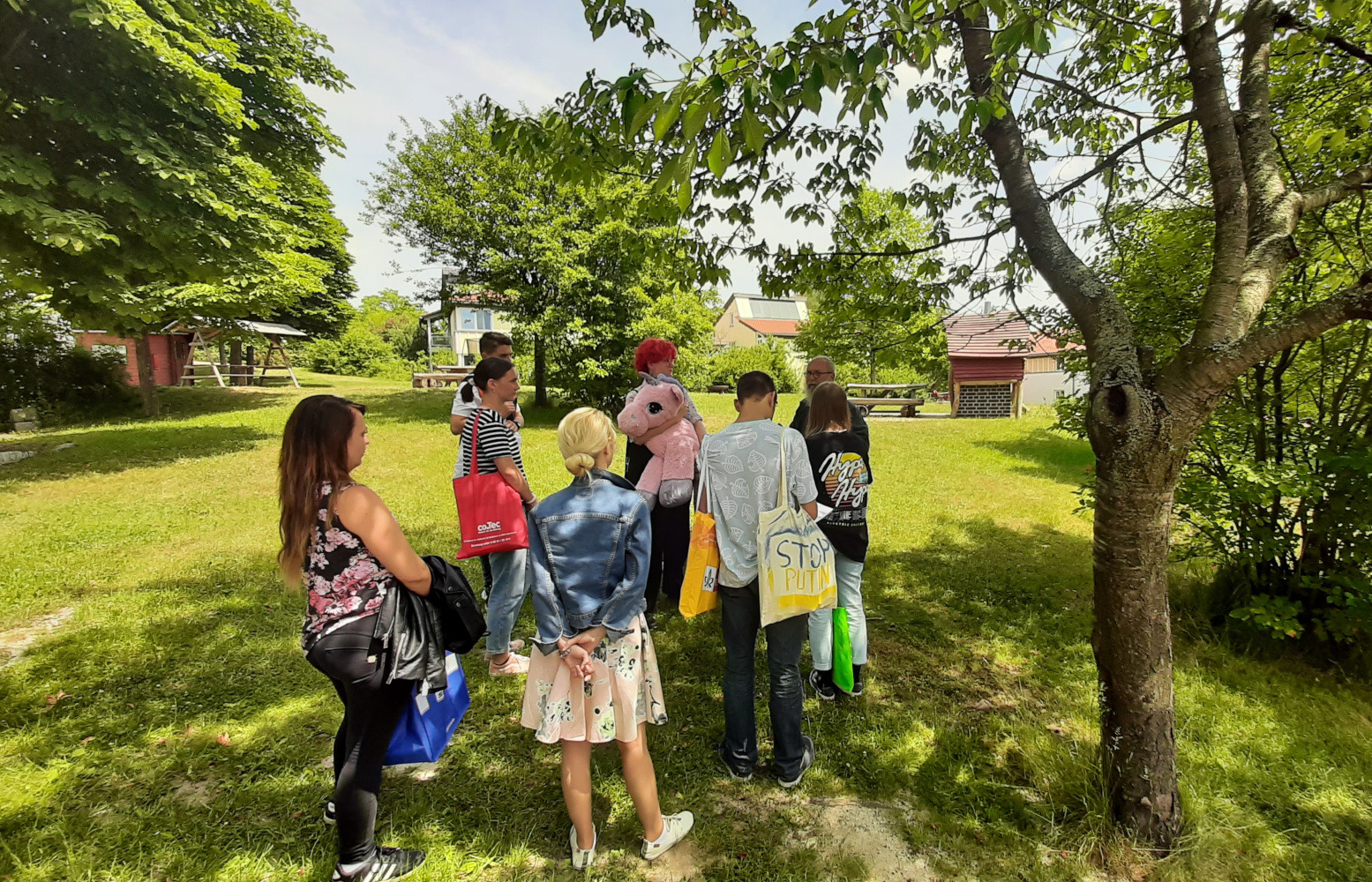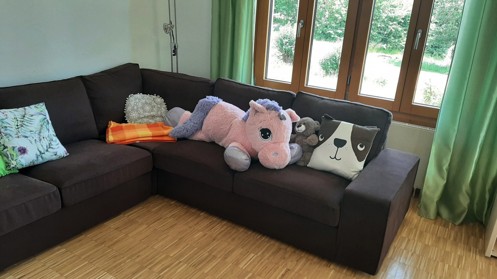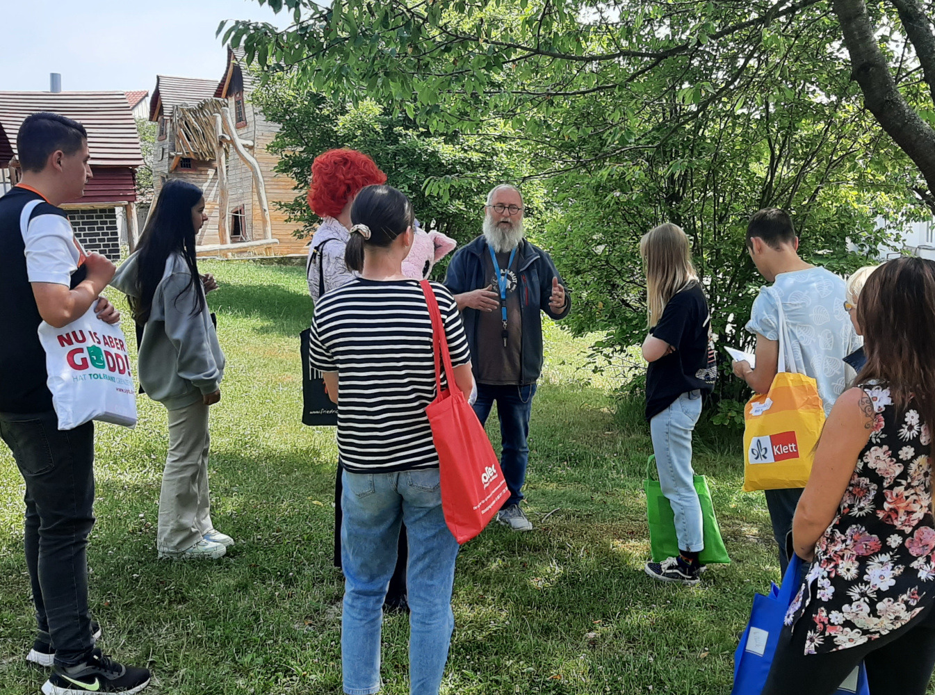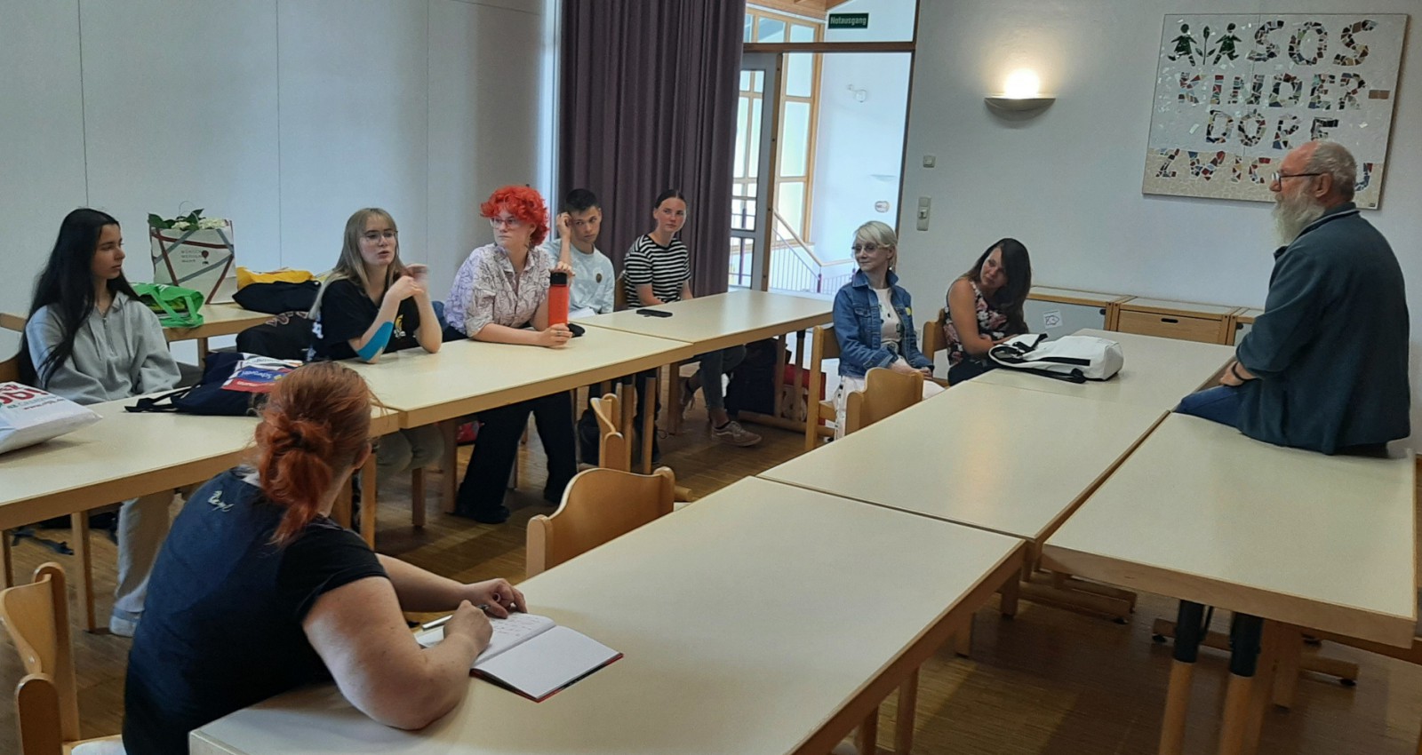 Angekommen im SOS – Kinderdorf wurden sie von dem Verantwortlichen für Spendenaktionen, Berthold Grenz, begrüßt und anschließend auf dem Gelände herumgeführt. Teile der mitgebrachten Spenden wurden dabei einer ukrainischen Familie mit sechs Pflegekindern persönlich übergeben. Auch eine weitere aus der Ukraine stammende Familie soll später noch in dem Kinderdorf einziehen und Anteil an den mitgebrachten Geschenken erhalten. Im Zusammenhang dazu hatten die SchülerInnen die Möglichkeit das dafür hergerichtete Haus von innen zu besichtigen. Die Möbel für die Inneneinrichtung des Einfamilienhauses wurden ebenfalls von den insgesamt 12.800 durch Spenden eingenommenen Euro finanziert. Beim Aufbau der Schränke, Tische und Betten halfen auch Jugendliche aus dem Dorf. Auf einem der aufgebauten Couchen fand schließlich auch das Einhorn einen Platz. Die SchülerInnen hatten damit die Chance zu sehen, was aus den gesammelten Spenden geworden war und inwiefern diese den Familien helfen konnten.