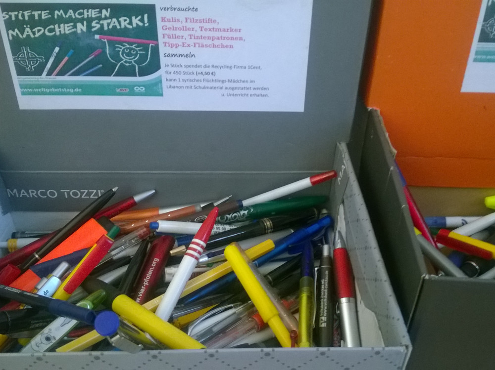 Schüler und Lehrer des Käthe-Kollwitz-Gymnasiums haben im Zeitraum von Anfang März bis Ende Mai 2018 über unseren Kontakt Herrn Hamm mehr als 4500 defekte Stifte an die Recycling-Firma weitergegeben und so über 45,00 € für Unterrichtsmaterial erarbeitet.