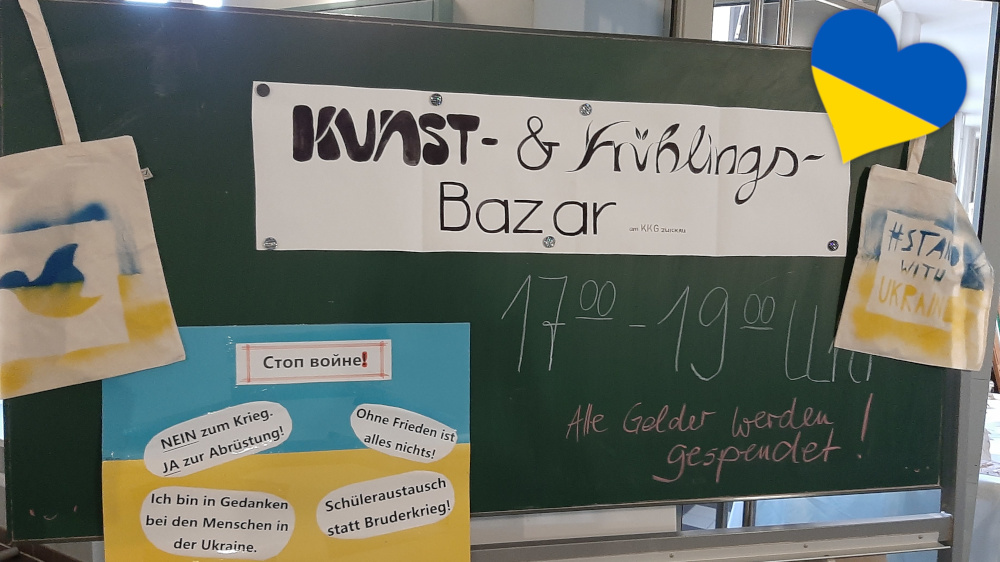 Nachdem zahlreiche Schülerinnen und Schüler bereits am 08.03.22 „Farbe bekannt“ hatten, fand nun am 21.03. und 22.03.22 der Kunst- und Frühlingsmarkt an unserer Schule statt. Mithilfe des Basars wurden Spenden für die Ukraine gesammelt.