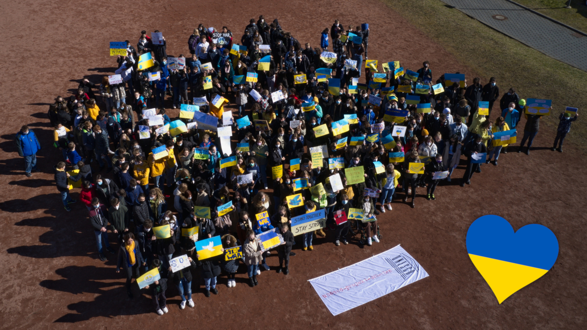 Die schrecklichen Ereignisse in der Ukraine und deren Folgen – Zerstörung, Angst und Leid – wirken nachhaltig auf die gesamte Schulgemeinschaft des Käthe-Kollwitz-Gymnasiums. Daher sind zahlreiche SchülerInnen und KollegInnen der UNESCO-Projektschule dem Aufruf „Farbe bekennen – für Frieden, gegen den Krieg“ gefolgt. Sie gestalteten Plakate mit klaren Botschaften und trafen sich am Dienstag, dem 08.03.2022, in der Mittagspause auf dem Schulhof zu einer gemeinschaftlichen Bekundung ihrer Standpunkte.